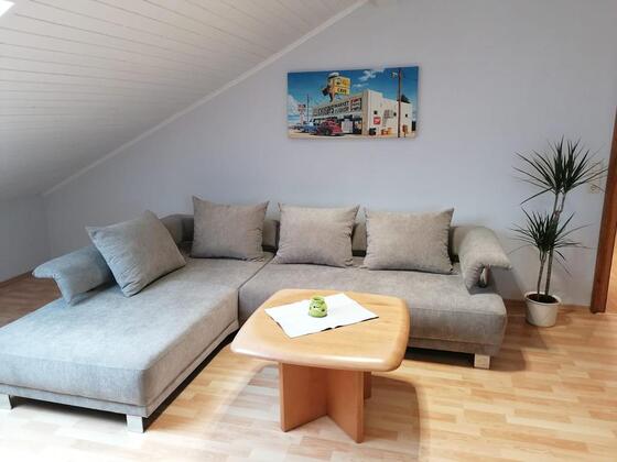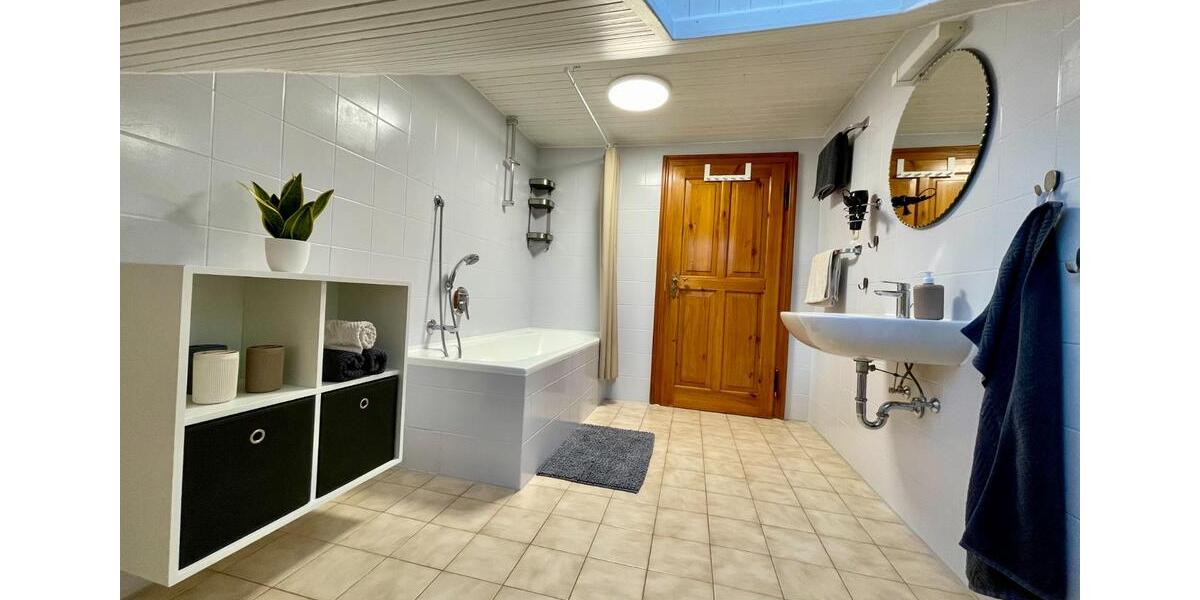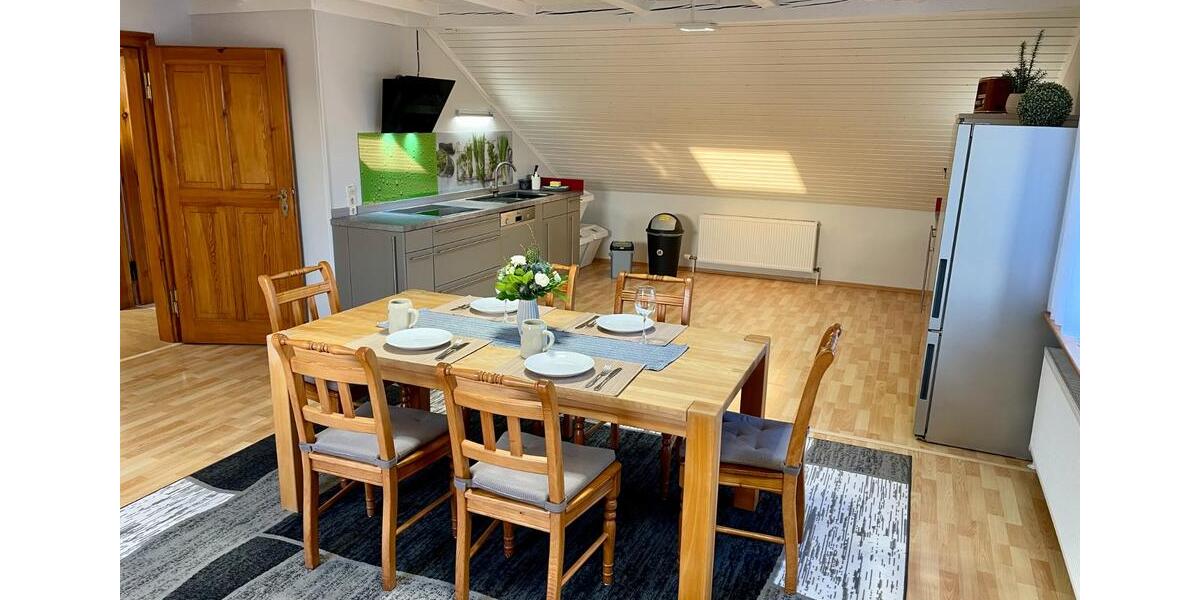 Großzügige Ferienwohnung mit getrenntem Wohn- und Schlafräumen. Wohnbereich mit Schlafcouch, SAT-TV, Esstisch. Gut ausgestattete Küche mit 4er Cerankochfeld, Kühlschrank, 3 Gefrierfächer, Spülmaschine, Radio, Mikrowelle, Wasserkocher und Kaffeemaschine. 1x Schlafzimmer mit Doppelbett, 2x Schlafzimmer mit je zwei Einzelbetten. Badezimmer mit Duschbadewanne, Waschtisch, Kosmetikspiegel und Fön. separates WC, Klo-Papier ist vorhanden, kostenloses W-LAN, eigene große Terrasse mit Grill und kostenloser großer Parkplatz.